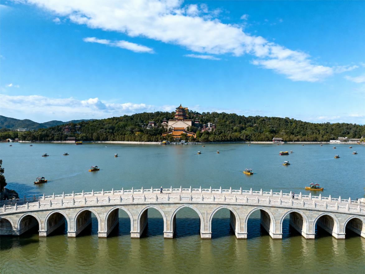 Imperial garden with Kunming Lake, marble boat, and Long Corridor (world's longest painted gallery at 728m).