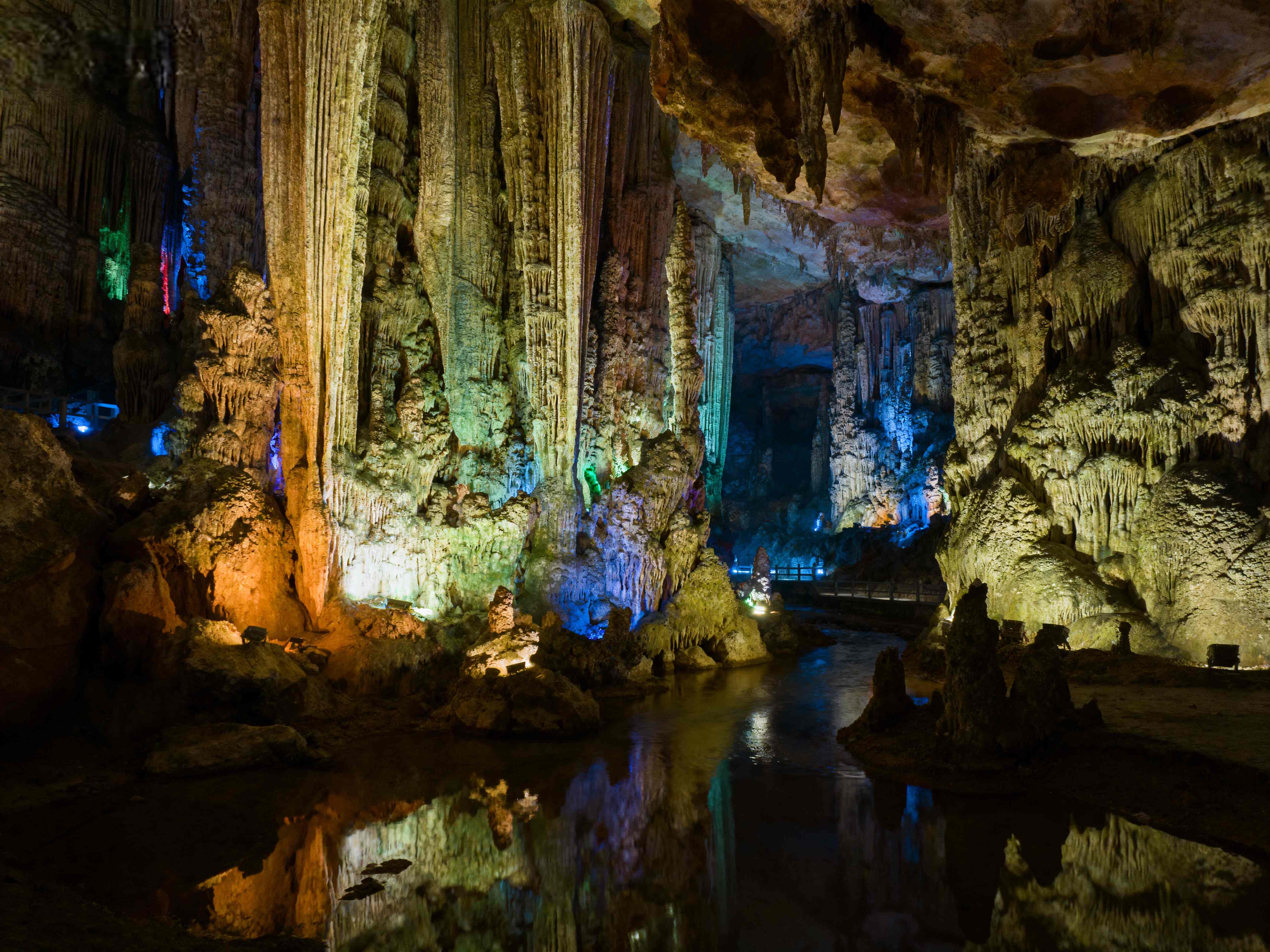 Spectacular limestone cave with colorful lighting, stalactites, and underground lake. 240m long.