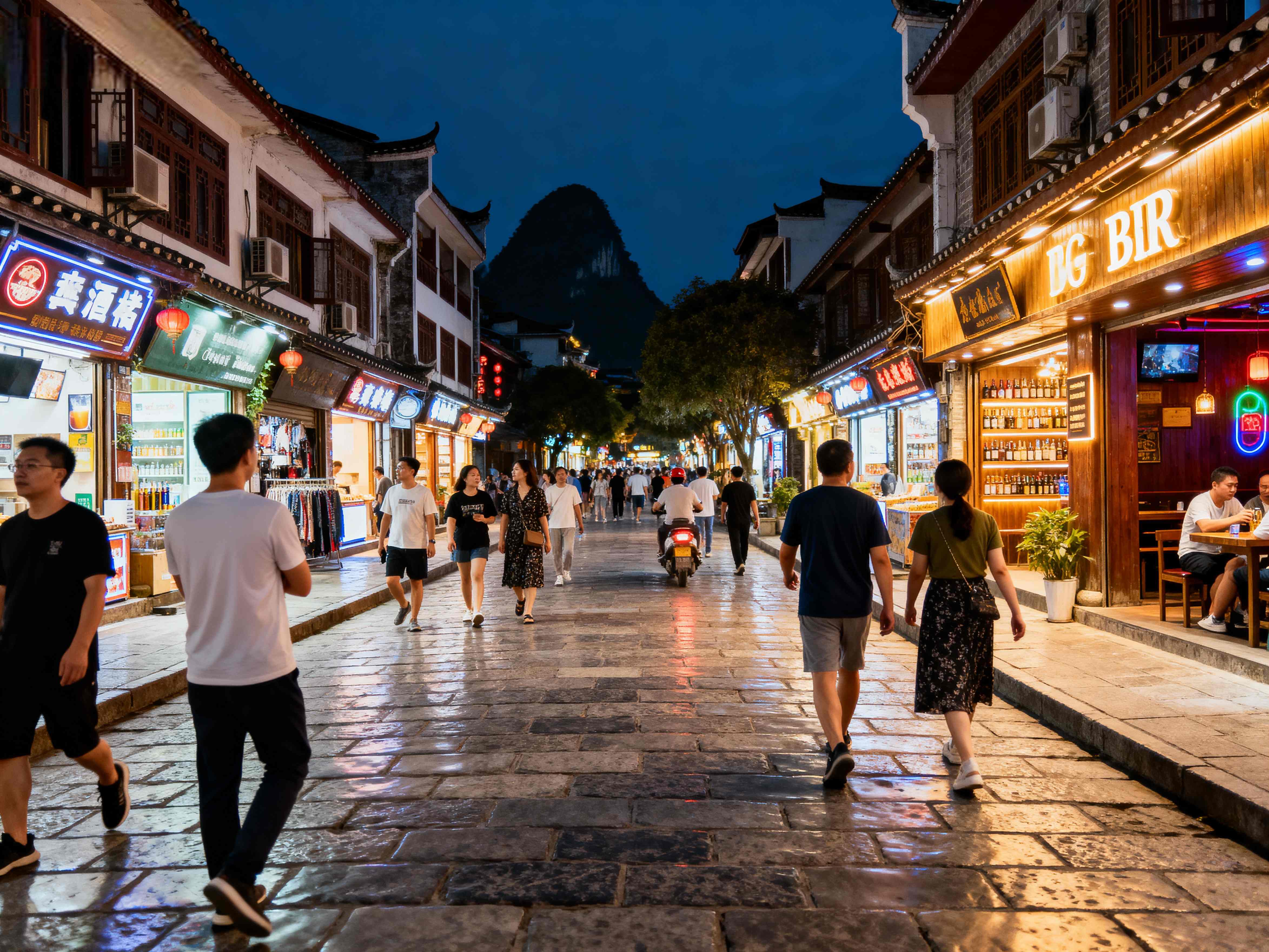 The second activity was cycling along the Ten-Mile Gallery. The air in Yangshuo is slightly cool in the early morning. Cycling through the karst peaks, the rice fields shimmered with green light, and wisps of smoke rose from the farmhouses along the roadside.:3:West Street in