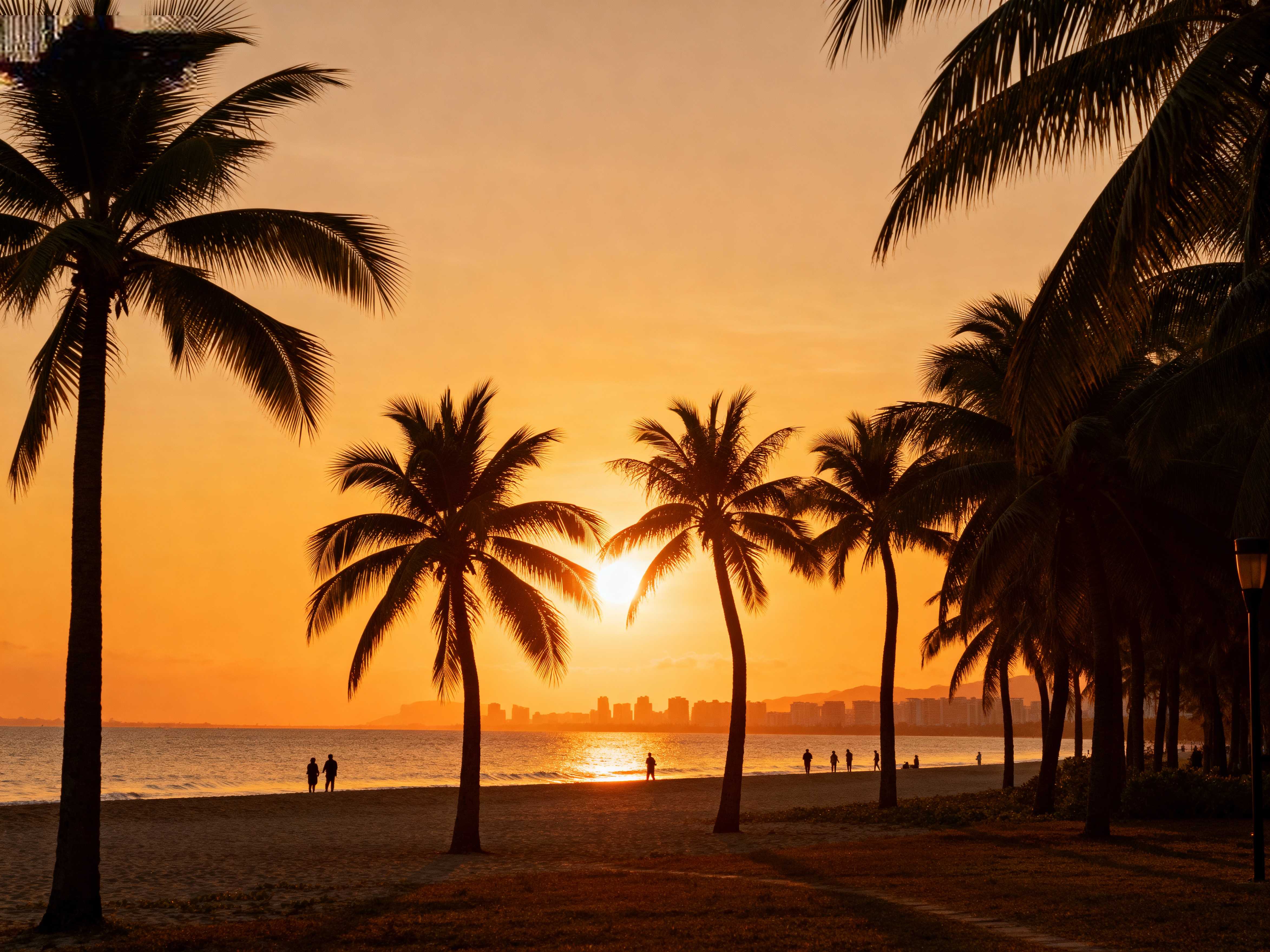 Long urban beach with coconut trees. Sunset views and budget-friendly hotels.