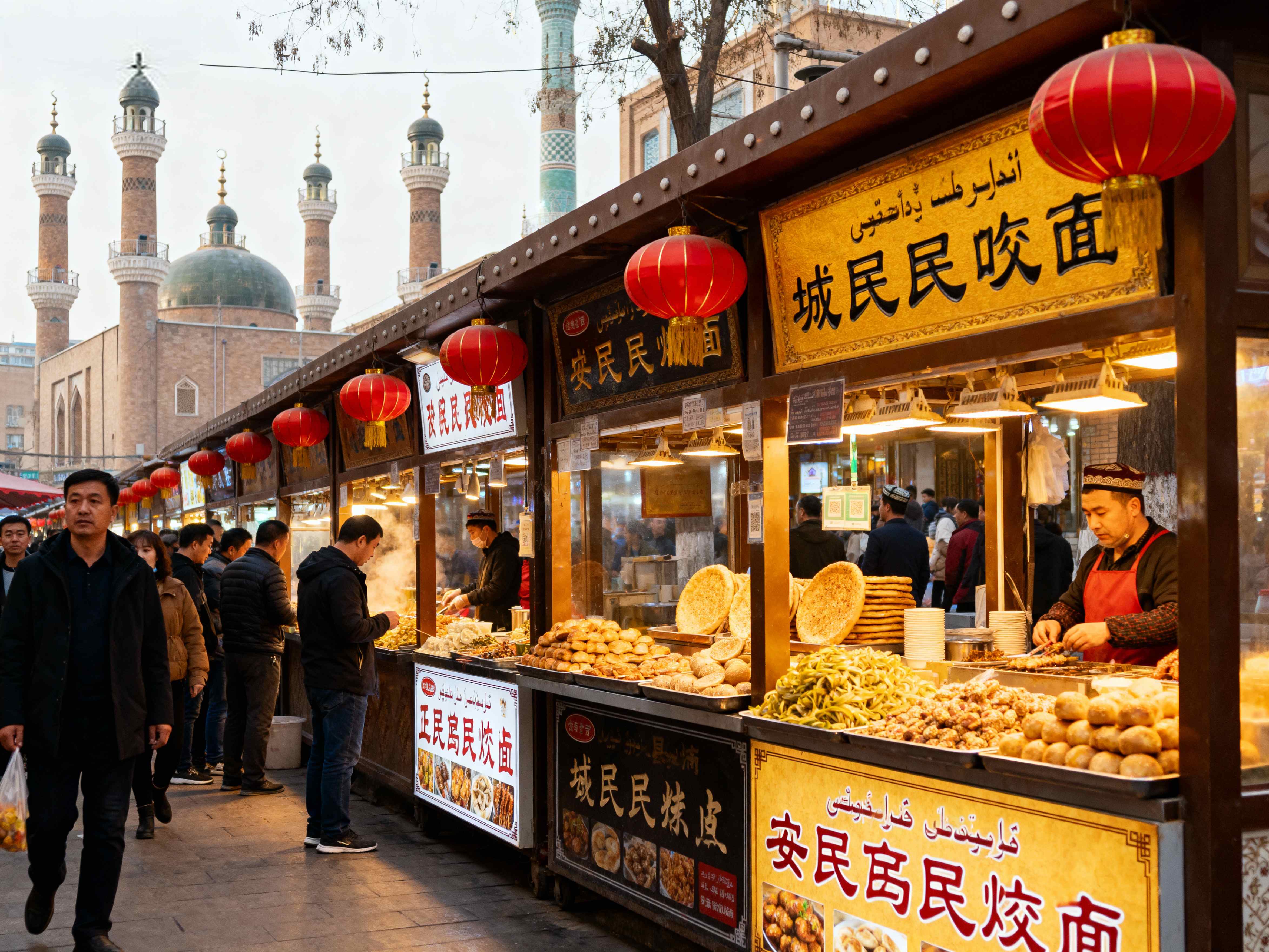 Vibrant food street with Islamic architecture, street food, and souvenirs. Must-try: roujiamo (Chinese burger).